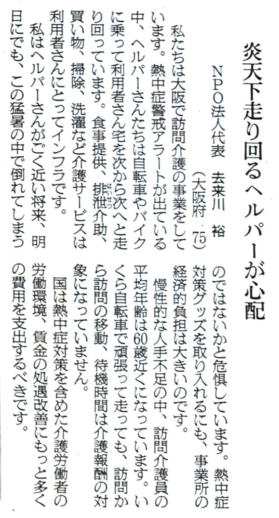 朝日新聞にコラム掲載 投稿公開日:2024年9月21日 投稿カテゴリー:お知らせ 代表 去来川の投稿が2024年9月18日発刊の朝日新聞に掲載されました。 拡大記事を掲載しますので、ぜひお読みください。 その他の記事を読む 前の投稿家族見学会のご案内 次の投稿5/17出版!! 代表著作「藍と青」 おすすめ 家族見学会のご案内 2024年6月27日 介護フェスティバルのお知らせ 2025年6月26日 5/17出版!! 代表著作「藍と青」 2025年5月13日