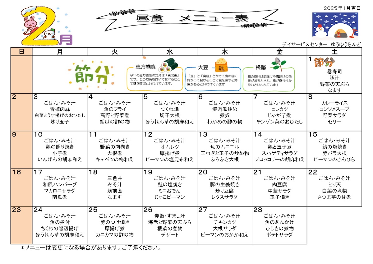2月の昼食メニュー 投稿公開日:2025年2月3日 投稿カテゴリー:昼食メニュー その他の記事を読む 前の投稿8月の昼食メニュー 次の投稿8月昼食メニュー おすすめ 8月の昼食メニュー 2024年8月1日 8月昼食メニュー 2025年8月16日 9月昼食メニュー 2025年8月25日