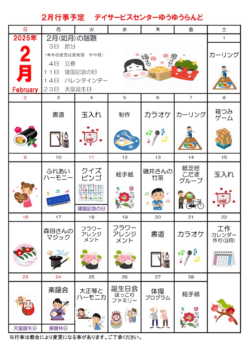2月の行事予定 投稿公開日:2025年2月3日 投稿カテゴリー:行事予定 その他の記事を読む 前の投稿8月の行事予定 次の投稿8月の行事予定 おすすめ 7月の行事予定 2024年6月27日 8月の行事予定 2024年8月1日 9月の行事予定 2025年8月25日